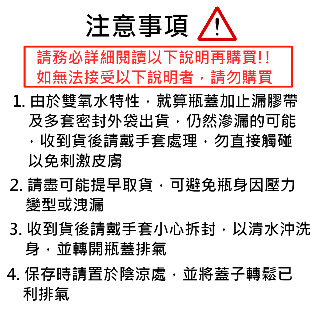 1.由於雙氧水特性,就算瓶蓋加止漏膠帶及多套密封外袋出貨,仍然滲漏的可能,收到貨後請戴手套處理,勿直接觸碰以免刺激皮膚。